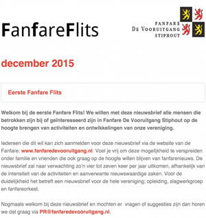 De eerste Fanfare Flits is verzonden! Met deze digitale nieuwsbrief alle mensen die betrokken zijn bij of geïnteresseerd zijn in Fanfare De Vooruitgang Stiphout op de hoogte brengen van activiteiten en ontwikkelingen van onze vereniging.
