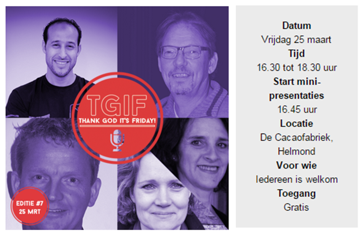 Komende vrijdag Thank God it's Friday in de Cacaofabriek: Met: Chaib El Maach – Sport: product of middel? | Jan van Bommel – Ready to Rock! | Lavinia Germano – Ons Anna | Louis van de Werff - Haw van ut Hellemonds