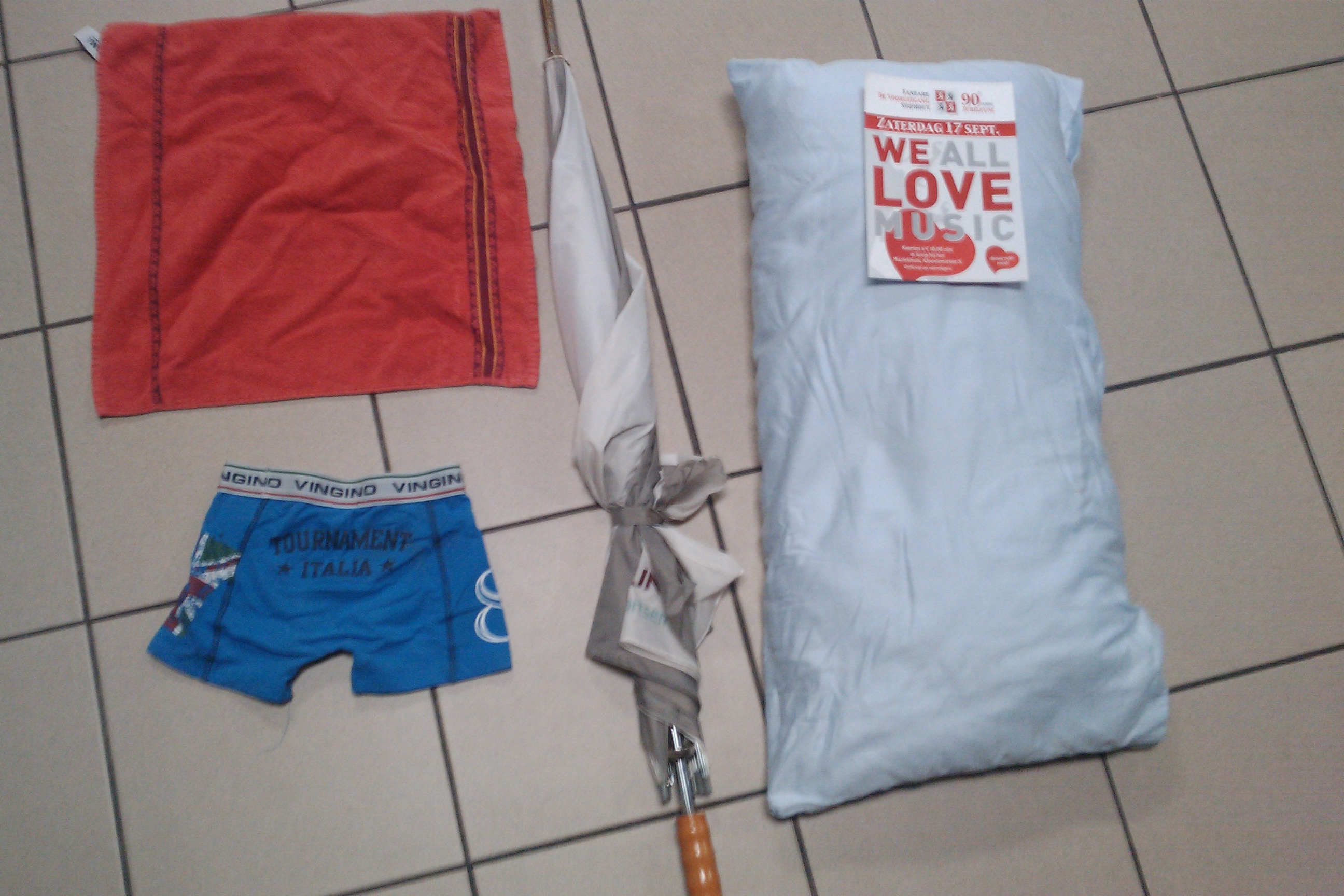 De gevonden voorwerpen liggen in het fanfaregebouw: een paraplu, een onderbroek, een handdoekje en een kussen: